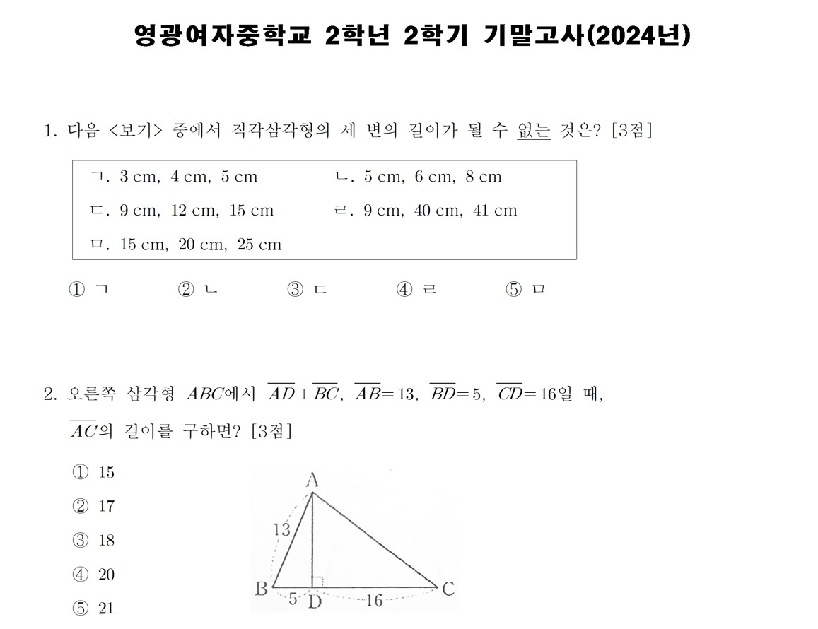 2024년 영광여자중학교 2학년 2학기 기말고사